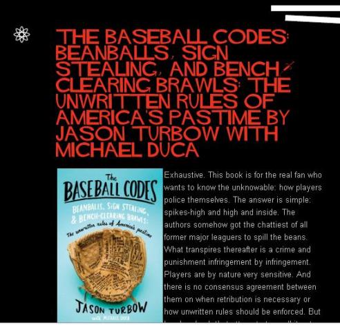 Exhaustive. This book is for the real fan who wants to know the unknowable: how players police themselves. The answer is simple: spikes-high and high and inside. The authors somehow got the chattiest of all former major leaguers to spill the beans. What transpires thereafter is a crime and punishment infringement by infringement. Players are by nature very sensitive. And there is no consensus agreement between them on when retribution is necessary or how unwritten rules should be enforced. But here’s a book that attempts to spell it out and illuminate the different philosophies behind when to retaliate. Strong Buy. A baseball dork’s delight. Nolan Ryan figures prominently. Good to pull of the shelf that summer night after your favorite player gets hit between the shoulder blades with a fastball. Very aptly shows how the game is changing—and depicts baseball as it was as an old school game of tit-for-tat. Truly enjoyable hot stove reading for this gentle correspondent. Loved the Rays-Sox scoop—great to finally get the story on all that nonsense.