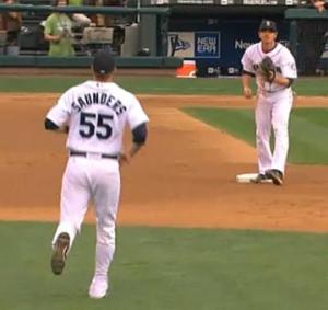Franklin Guttierez urged Saunders to do it from his position in center field. After the game, Mariners manager Don Wakamatsu said that a more experienced outfielder (Saunders is in just his second season) might feel more comfortable about making such a play without offending the opposition.