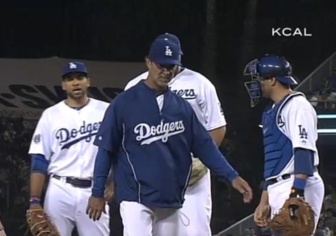 Los Angeles closer Jonathan Broxton came on in the ninth to protect a 5-4 lead, and promptly loaded the bases with one out. Mattingly visited the mound to inform members of the infield where he wanted them positioned. After he turned to leave, however, first baseman James Loney asked another question. Mattingly returned to address it, before heading to the dugout. (Watch it here.)