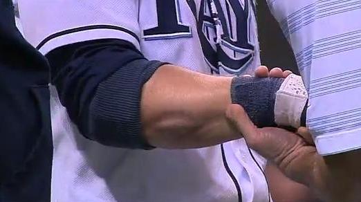 The baseball’s imprint can be clearly seen on Will Rhymes’ arm, moments after impact.