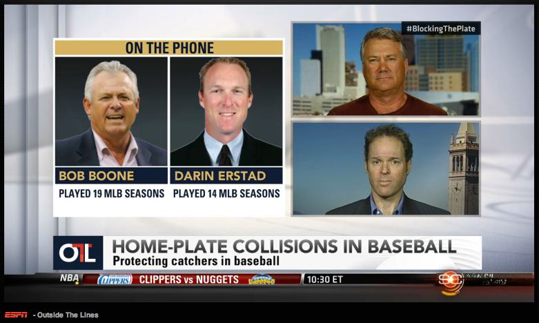 So I was on ESPN’s Outside the Lines yesterday, talking catcher collisions. They asked, I said yes. Then I found out I’d be on alongside Terry Kennedy, Bob Boone and Darin Erstad, each of whom … how best to say this … has just a touch more experience with the subject than myself.