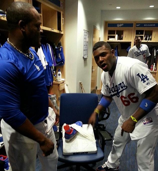 Thanks to a 5-0 victory, the Dodgers were able to have fun with it, Adrian Gonzalez presenting Uribe with third base—complete with a taped-on cleat—after the game. (See image below, courtesty of @yasielpuig.)