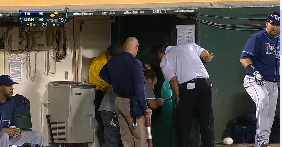 “It was a kind of a fun moment,” added Rays manager Joe Maddon. “We kind of rallied then—we should have kept him in there. A lot of the commotion in the dugout in the eighth inning and part of the rally was someone beating on the door. Finally someone broke the door knob with a bat to get him out. I don’t even know who the hero was getting him out.”