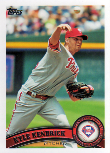 Kendrick cardKyle Kendrick was frustrated on Saturday. He was pitching well right into the sixth, had helped his team to a 5-1 lead. Then, after a Buster Posey leadoff single, Pablo Sandoval popped up for what should have been the inning’s first out. But the ball fell between Ryan Howard and Chase Utley, at which point Utley tried to flip the ball to second for the force … which would have worked, had his throw not pulled Jimmy Rollins off the bag.