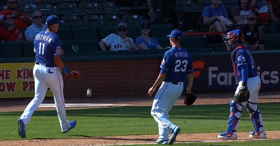 The moment that has gained the most notice was the decision by Rangers first baseman Ronald Guzman to allow a popup, tapped some 30 feet down the line, to drop untouched in foul territory. Ceding an easy putout brought the count on the batter, Chris Owings, to 1-2, and put pitcher Mike Minor in position for a strikeout.