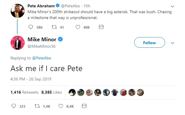 For some reason, though, Boston was adamant that he not reach his goal. This is different than being at the wrong end of a no-hitter or losing a playoff clincher, outcomes that bear at least some degree of ignominy. Two hundred strikeouts in a season can be personally relevant to the pitcher who throws them, but it’s hardly a sign of statistical dominance. Minor ranks 10th in the American League in strikeouts, more than 100 behind Gerrit Cole. Precisely nobody outside of the Minor household should care about who he set his mark against.