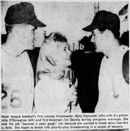 News came down yesterday that Betty Caywood, who briefly worked as a broadcaster for Charlie Finley’s Kansas City Athletics, passed away earlier this month at age 89. I wrote the following about her for The National Pastime Museum, a site that no longer exists, back in 2017.