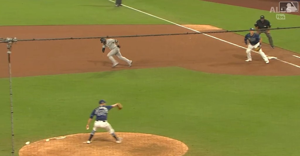 The game was tight until the ninth, when Giancarlo Stanton’s grand slam off of Rays reliever John Curtiss gave the Yankees their six-run cushion. Curtiss—who by that point had given up two singles, two walks and Stanton’s homer, five runs in all, while recording only one out—threw his second pitch to the next hitter, Gio Urshela, high and tight. Torres, batting next, got a similar treatment.