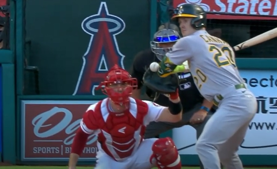 Which brings us to today’s topic: Why Melvin was asked about Canha in the first place. Last Thursday, Canha leaned into a pitch from LA’s Dylan Bundy, taking it off of his sizeable elbow guard. There’s a rule about batters making an effort to avoid a pitch in order to be awarded first base, but even though Canha literally did the opposite of that, the rule was not invoked here. He’s tied for the major league lead with 18 HBPs this season—six of which have come against the Angels.